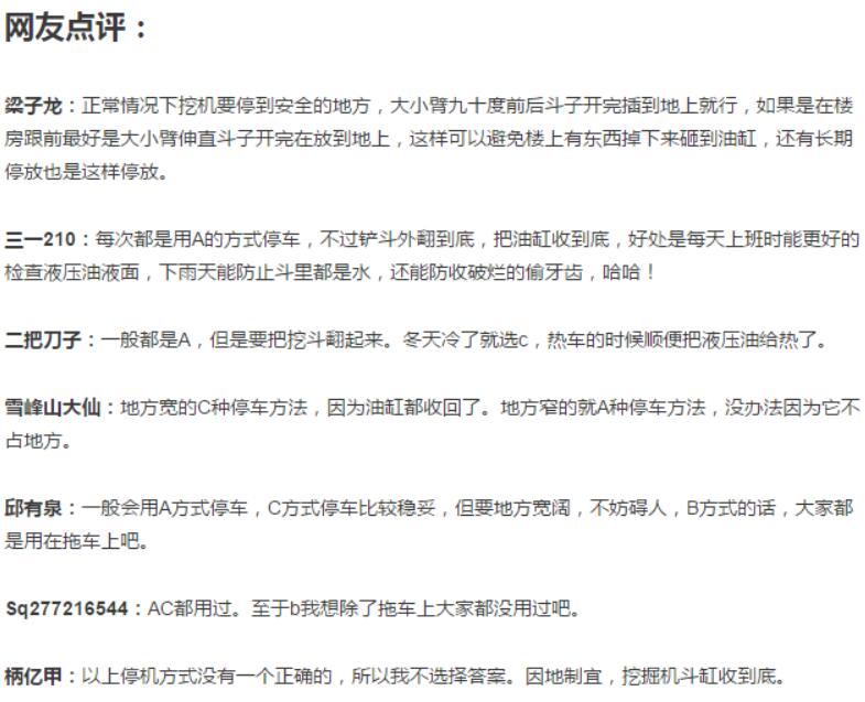 B:這種停車時油缸油封受力,而且油缸裸露在外面,所以在工地上幾乎沒人才用。但在挖掘機運輸時,這是最常見的停放方式。這樣停放可以最大限度降低挖機的高度和長度,裝車后不會超高超長,方便平板運輸車轉運。