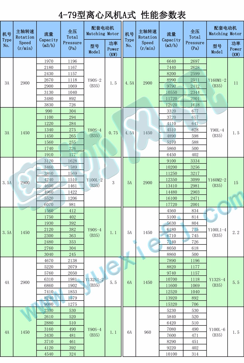 離心風機的出口位置,以機殼的出風口角度表示。4-79№3A~6A在出廠時均做成一種型式:出風口位置調整范圍0°~255°,間隔是45°,№7C~8C出風口位置調整范圍0°~180°,間隔是22.5°;№10E~20E單進風和雙進風出風口位置均制成固定的三種:0°、90°、180°,不能調整,如果您想要特殊機號、特殊出風口角度等非標號,我廠也可為您設計和制造,但訂貨時需詳細注明。