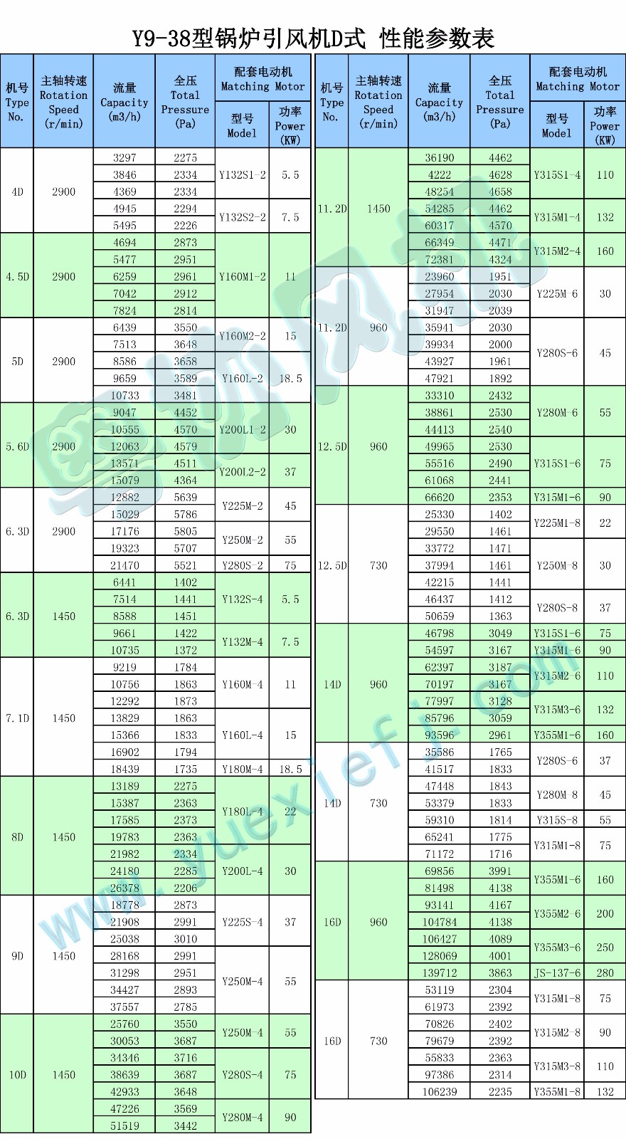 1、Y9-38型鍋爐引風機制成單吸入。機號№4、5、6.3、8、10、12.5六種。