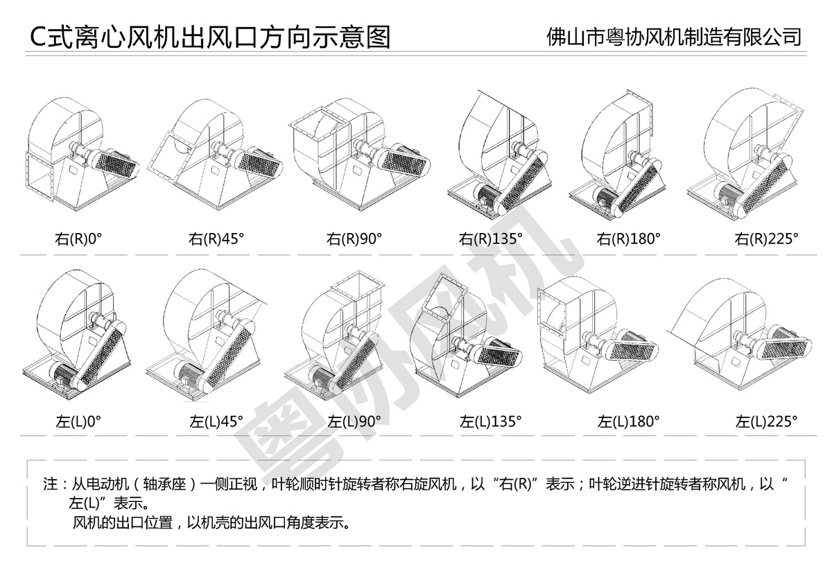 3、鍋爐風(fēng)機(jī)的出口位置以風(fēng)機(jī)機(jī)殼的出風(fēng)口角度表示,“左”“右”均可制成0°、45°、90°、135°、180°、225°六種角度。